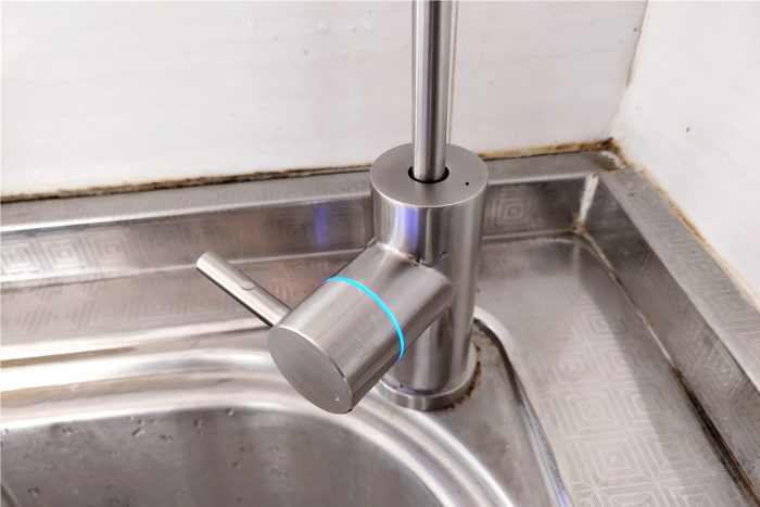 352智能净水器的专用水龙头在把手处还加入了一圈LED指示灯,当开启水龙头后,指示灯会显示为蓝色,相比触控版的水龙头来说,这种手动把手设计的使用起来要更方便些。另外水龙头指示灯还具有换芯和故障提示功能,其中蓝色闪烁是换芯提示,蓝色闪三下熄灭是故障提示,可以让用户无需打开橱门就能了解净水器的当前工作状态。