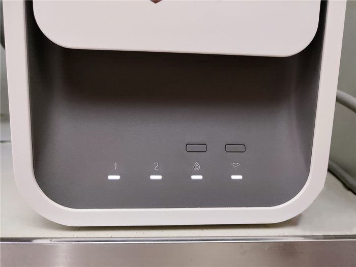 在机身正面靠近下方的位置有4颗LED指示灯,从左到右依次为复合滤芯指示灯、RO反渗透滤芯指示灯、自动调温指示灯和WiFi指示灯,另外还配备了自动调温开关和WiFi联网按键,用户可以根据指示灯的状态了解净化器的当前工作状态。