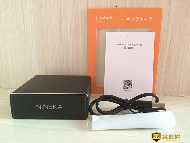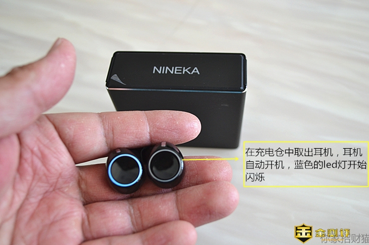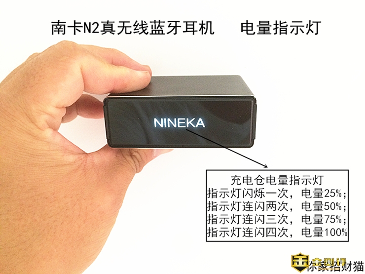 充电仓黑色磨砂表面和四角的圆润化处理,防滑防汗防磕碰的同时给人以超级棒的质感,充电仓的顶部有NINEKA标志,这个标志会在充电的时候闪烁,并能够通过闪烁的次数来提示电量,提示25%、50%、75%和满电四个阶梯的内存电量。