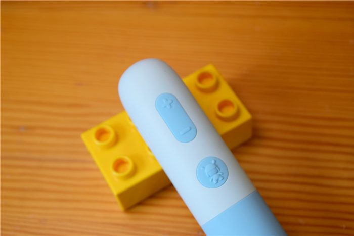 米兔点读笔的正面靠上方的位置有3枚实体按键,从上到下依次为音量加键、音量减键和开关键,按键采用凸起设计,表面还加入了硅胶材质,操作起来更方便,而且手感舒适。