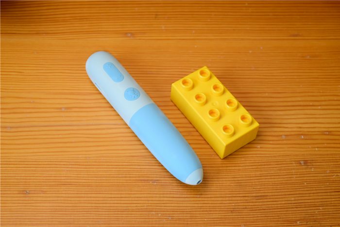 米兔点读笔采用了白蓝相间的配色,产品尺寸为130mm*25.5mm*24.6mm,整体设计很简洁,其中白色部分采用了ABS材质,蓝色部分采用了硅胶材质,产品符合美国FDA食品接触标准要求,宝宝使用起来更安全。