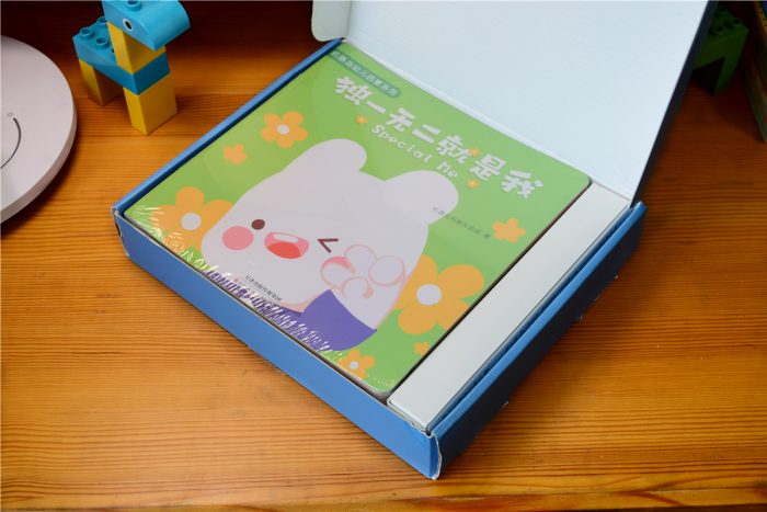 开启包装盒后,可以看到内部的空间利用很充分,左侧放着22本绘本,表面还加入了塑封膜,可以对书籍起到一定的保护作用,右侧是个白色的小包装盒,里面放置的是点读笔和配件。
