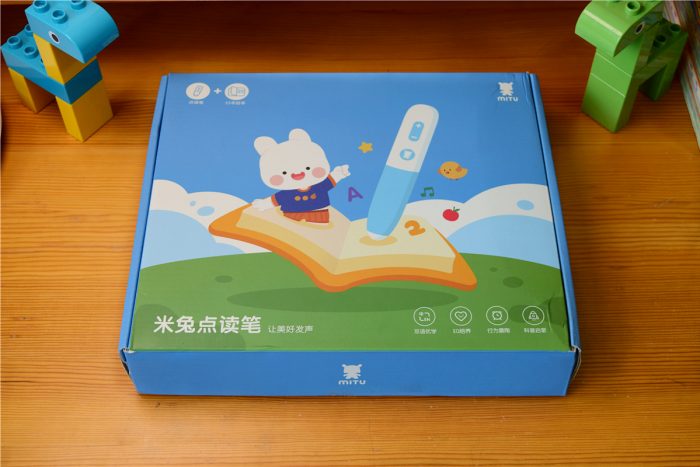 米兔点读笔采用了蓝色的纸质包装盒,拿在手中沉甸甸的,正面是卡通设计的米兔和点读笔形象,另外还有产品名称和特色功能介绍,背面左下角是盒内的物品详单。