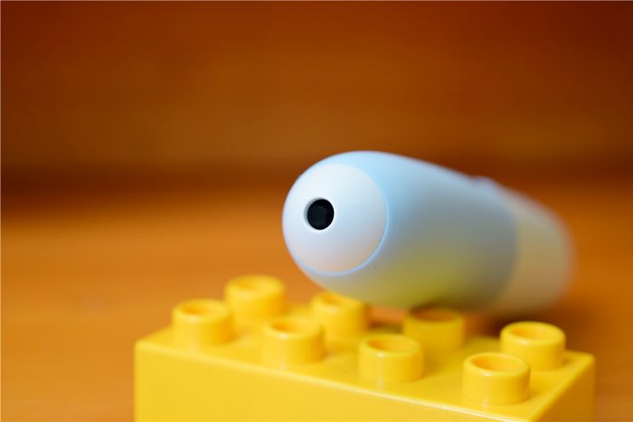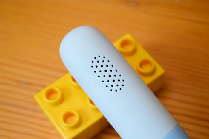 米兔点读笔背面靠近上方的区域是扬声器孔,内置定制喇叭,可以还原数字原声,而且官方对于音量大小也做限制,可以对孩子的听力起到保护作用,而且即使开到最大音量,也没有破音现象发生,音质表现还是不错的。