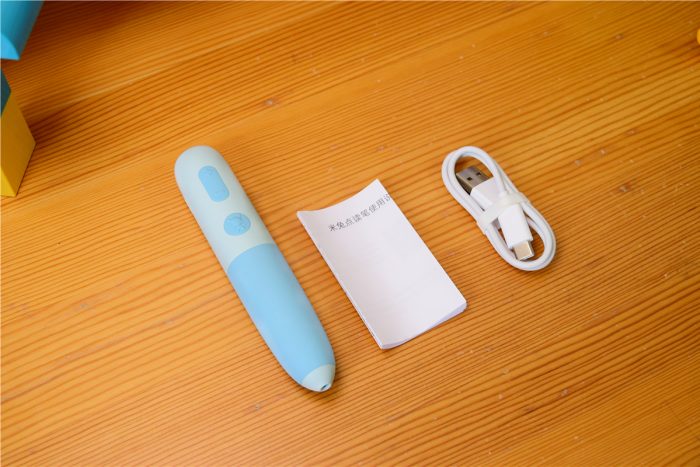 米兔点读笔内部还有个小包装盒,正面印有产品的实物图片和名称,背面是关于产品的参数介绍,盒中除了米兔点读笔外,另外只有使用说明和充电线了,并没有配备充电插头,可以使用手机插头或带电流输出的USB接口直接进行充电。