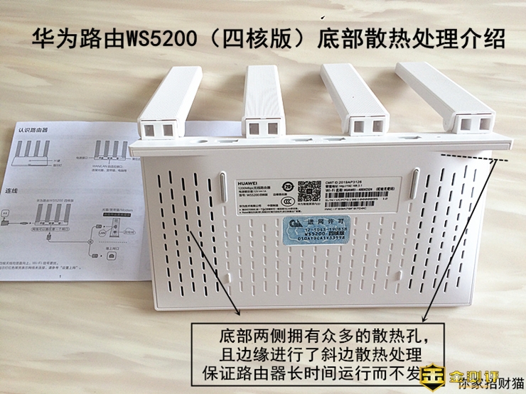 整个华为WS5200四核版路由器的机身被设计成了楔形,使得WS5200从正面看非常薄,天线折叠时远看就像一本书。路由器底部采用的是倒梯形设计,在两侧弧度上设计有散热孔,众多的散热孔可以保四核版路由器长期工作高速运作时不发烫不卡顿不死机,在机身底部中间位置还设计有两条防滑胶垫,可以保证路由器在任何一个桌面上都能平稳安置。