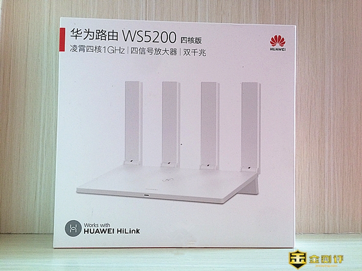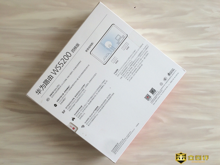 不过,华为WS5200(四核版)路由器的整体包装简洁大气不失完美感,整体乳白色的色调感让人感觉很亲切温馨,中间大大的产品定妆照给用户以造型简约,颜值在线的良好印象,右上角是华为的品牌菊花logo,看到它就让人有“支持国货 振兴中华”的冲动,左上角是产品的型号和卖点的小介绍,后面咱们会再次介绍!