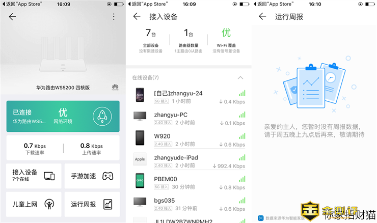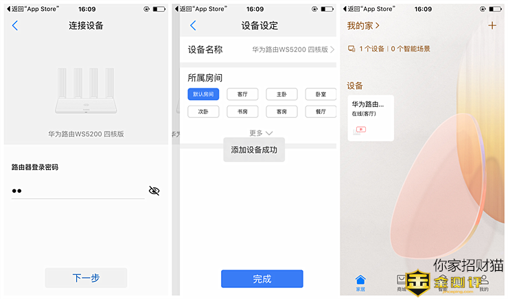 通过华为路由器WS5200四核版,智能电视、智能空调、智能扫地机器人、智能空气净化器等等智能家电,还有智能音箱、智能门锁、智能灯等等智能数码设备,是招财猫后期家居品味生活体验中的重中之重。