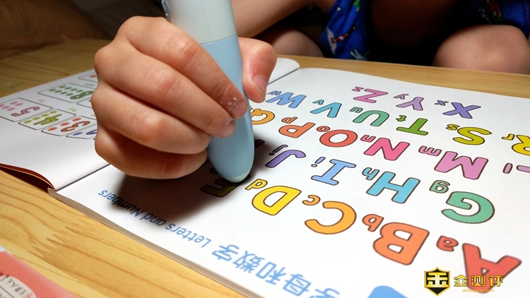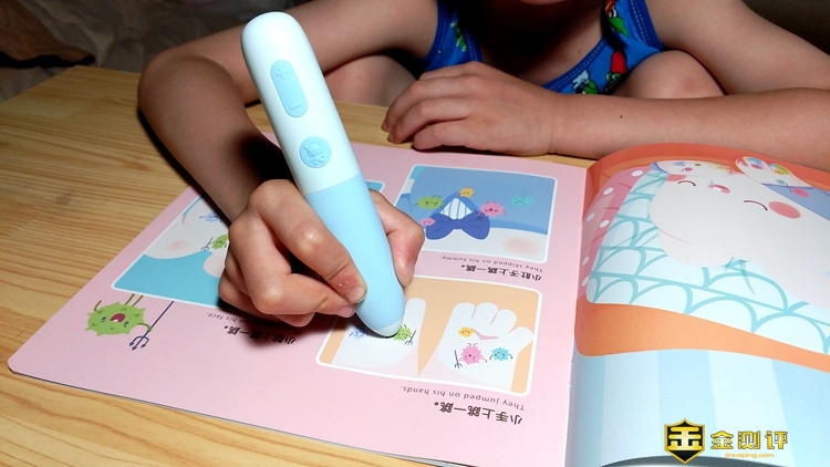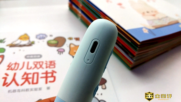 点读笔比较粗,小孩子使用起来会感觉略重。笔的做工非常细腻,用料扎实,深色部分为食用级硅胶材质,防滑效果很好;浅色部分为塑料,仔细察看没有任何飞边毛刺情况,闻起来有淡淡的清香。