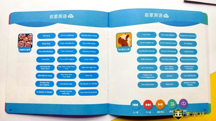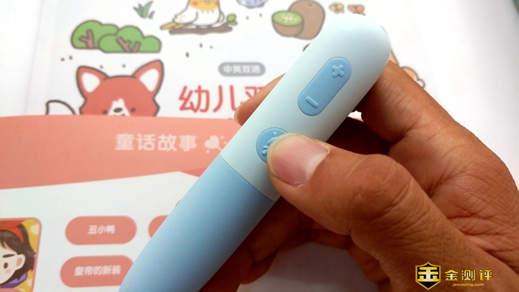 点读笔上设音量键和开关键,长按开关键则控制开关机,短按则进入故事机播放模式,播放中短按开关键,可依次切换欢乐儿歌、童话故事、国学经典、启蒙英语、自然旋律、宝宝最爱等内容,播放时长按音量键可切换内容。