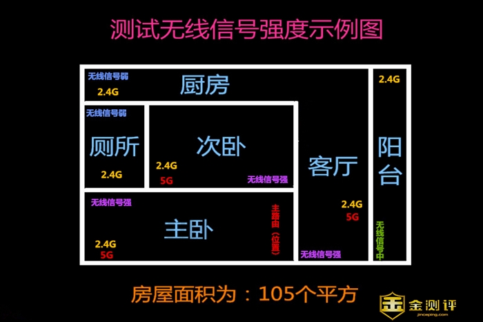 在Wi-Fi信号强度方面笔者也是通过实际的测试,同时也通过一张自绘草图可以发现华为WS5200四核版路由的四天线+四信号放大器的确不一样,无论是无线信号的覆盖率还是穿透率真的是扛扛的,笔者的房子是多层住宅,房子的面积为105个平方,路由器的摆放位置笔者选择在了卧室(如下图)。