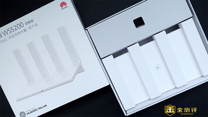 打开包装盒后,首先映入眼帘的是华为路由WS5200的四根可折叠天线和那个经典的“Hi”键。