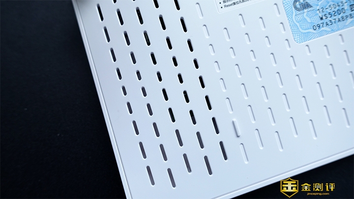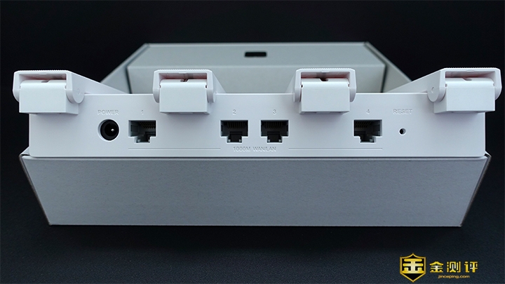 WS5200的尾部有四个千兆网口,这四个网口支持盲插,完全不区分WAN和LAN口,除了四个千兆网口外,还有一个电源插口和RESET按钮。