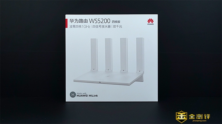 先来个简单开箱,华为路由WS5200和其他华为路由的包装风格非常相似,主要以白色为主色调,搭配红色配色构成,从盒子正面就可以看到具有四根加宽天线的华为WS5200宣传照。