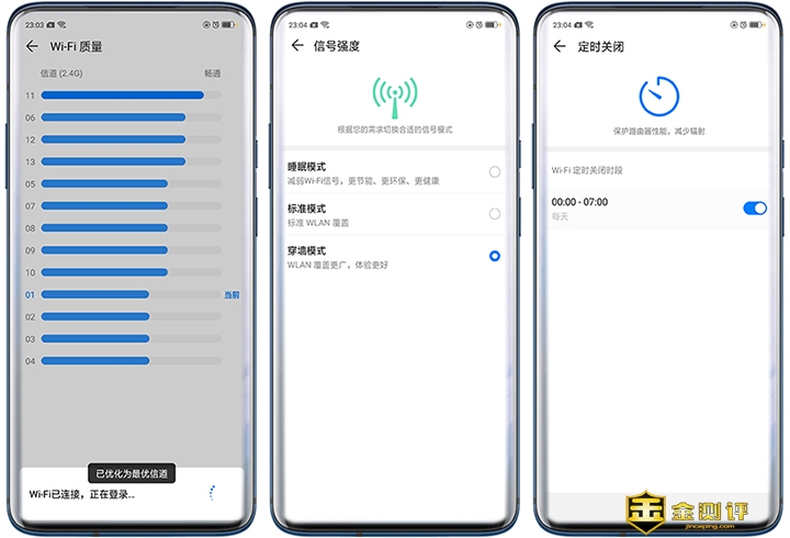 针对WiFi质量,可以检测每一条信道的通信质量,如果当前信道有干扰,还可进行优化干扰操作。在信号强度中,可以根据自己的需要选择信号强度模式,其中有睡眠模式、标准模式和穿墙模式。这次还增加了一个定时开关功能,可以设置路由器关闭时段,有效减少辐射。