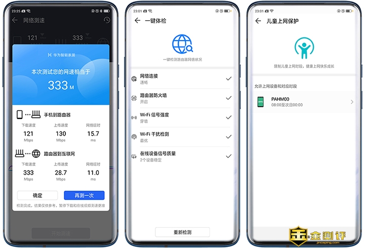 前面说过,光从外观上来看,并不能看出WS5200四核版与之前的版本有什么区别,那么这次在功能上又有什么改进呢?首先这次WS5200四核版APP在原来的基础上增加了网络测速功能,可以实时掌握自己的网速动态。在一键体检中,可以针对当前网络做一个全方位检测,主要针对的是网络连接情况、路由器防火墙是否开启、WiFi信号强度、WiFi干扰检测、在线设备信号质量检测等,如果检测到WiFi信号有干扰,还可以进行优化干扰等操作。华为路由WS5200四核版同时也把之前比较好用的儿童上网保护功能继承了过来,在APP中可以针对儿童上网设备进行设置和监控,严格控制儿童上网时间。