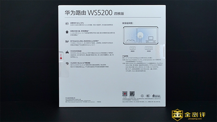 包装盒的背面是华为路由WS5200的主要卖点,自研凌霄四核1GHz处理器、四颗信号放大器、双千兆&5G优选、华为手机手游加速和HUAWEI HiLink IoT专属通道。