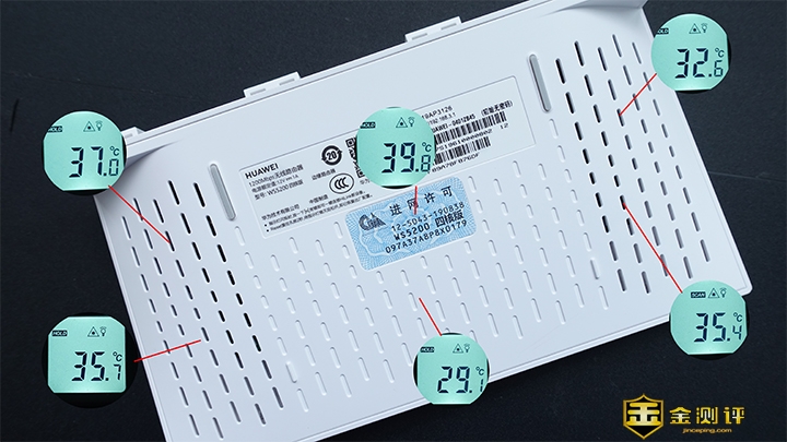 发热是与能耗成正比关系的,从前边的功耗测试可以推断出华为路由WS5200四核版能耗不算太高,从发热测试来看也确实符合能耗比较低的特性,在测试之前这款路由器已经稳定运行了48小时,一共测试了六个发热位置,最高发热温度有39.8℃,最低发热温度有29.1℃,两者均没有超过40℃。