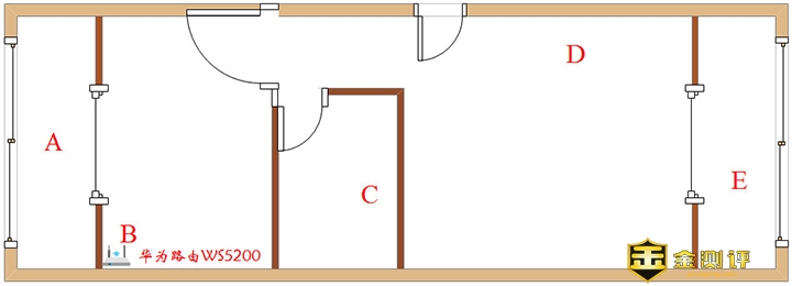 完成该次测试主要地点单位公寓住宅,面积为60平米左右,平面结构比较简单,如图一共选取了五个测试点,华为路由WS5200安置在B点位置,该次测试所用到的软件工具为WirelessMon(专业版)和SpeedTest。