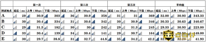 接下来再来看看传输速度测试,家里宽带为电信300M宽带,采用的软件为SpeedTest,由于截图较多,这里就不再采用截图的形式说明,只做了一张汇总表格。测试方式采用在每个测试点测试三次数据,然后求均值。可以看到在A、B、C和D点的下载速度都超过了200Mbps,但是唯独在E点的下载速度不足50Mbps,这也可以看出WS5200虽然内置了WiFi专属加速引擎,相比前代增强版,2.4GHz+5GHz 双频WiFi吞吐性能提升50%,但是依旧在穿墙效果表现上不是很好。