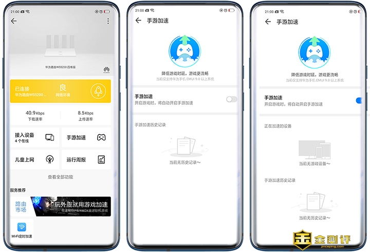 这次WS5200四核版还具有手游加速功能,但是仅支持华为EMUI9.0以上的系统,而我也特意找来了一台荣耀20i来测试这个功能,但是打开手游加速后,我这台机子并没有出现在【正在加速的设备】列表中,我也不知道是什么鬼,无奈只好放弃这个功能测试了。