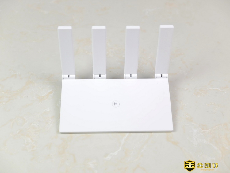 华为路由WS5200四核版是长方形的设计,虽然机身是塑料材质,但是质感相当不错。华为路由WS5200四核版具有4根天线,出厂时是折叠收纳在机身顶部的,在中间还可以看到H键。