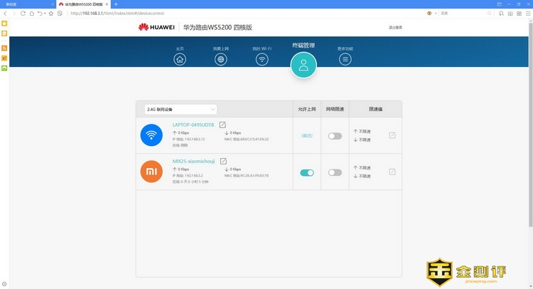 上网和WIFI在初始化都设置好了,所以这里也不用动了。终端管理可以看到所有连接到华为路由WS5200四核版的设备,这里可以对上传下载进行限速,可以拉黑,还能修改设备名,这样更好识别一些。