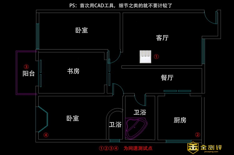 我家110平左右,CAD图的细节就不要在意了,反正户型大概如此。路由器放在客厅的电视柜上,接近于整个房间的中心,但是还是偏右上方一些。