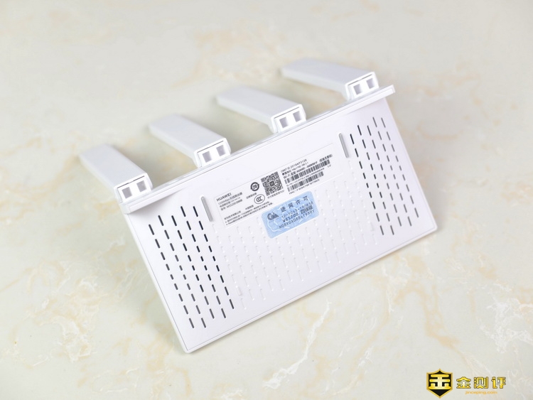 华为路由WS5200四核版的背面两侧设计有大量的散热栅格,中间还贴有一张进网许可,在进网许可上面贴有一张铭牌标签,上面印有华为路由WS5200四核版相关的信息。