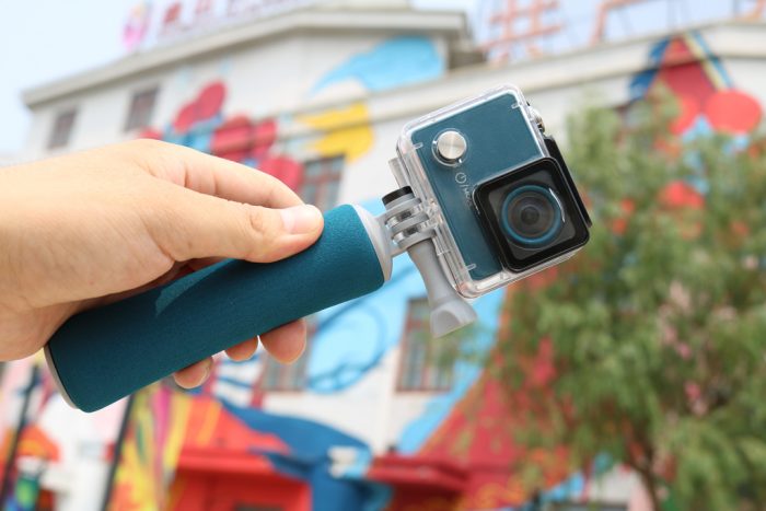 海鸟运动相机的浮水杆是用于游玩不慎丢失时配置的,会因为直接漂浮在水上不会沉底。小编实际测试,有些偏头重较轻,机身偏下方。浮水杆具有防滑的海绵,底部配有挂绳扣,还可以套在手上做双重保险。浮水杆与防水壳连接处可调整相机前后位置,方便游泳仰拍。