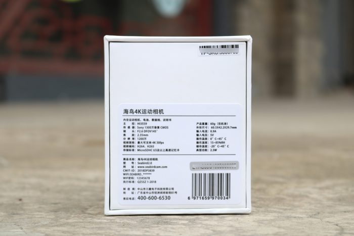 之前很少介绍产品的外包装情况,海鸟4K运动相机背部值得我们关注的是仔细标注了操作温度为0℃-45℃,操作湿度为15-85%RH,储存温度为-20℃-45℃。为何小编在这里强调了这些,后续就会知道了。
