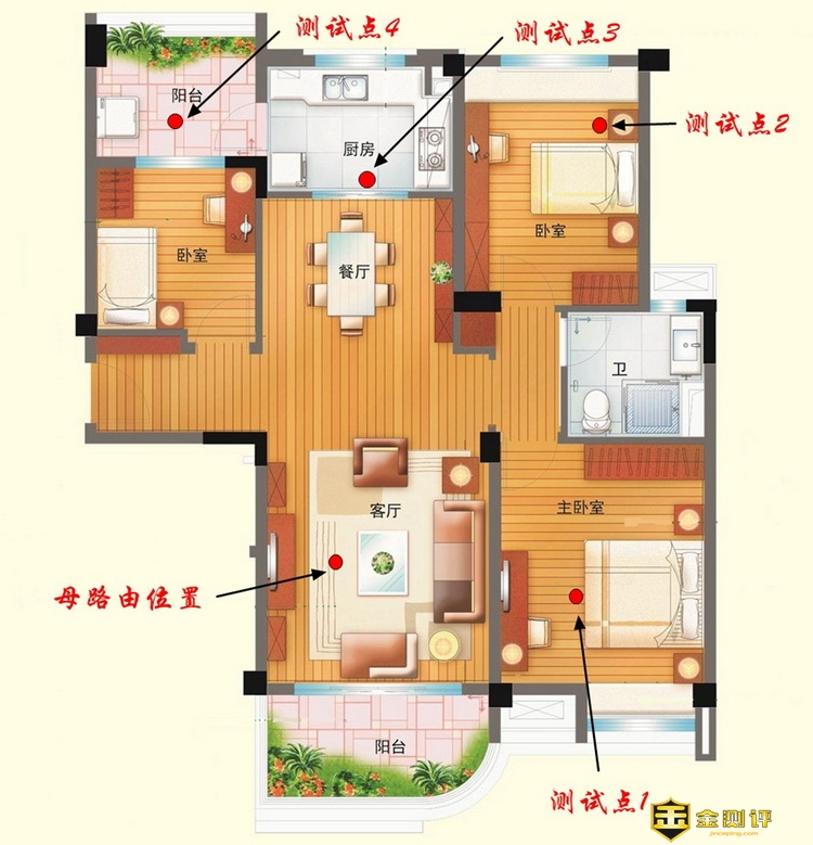 华为路由Q2 Pro支持2.4GHz和5GHz并发,联网设备可在两个频段之间自动切换,双千兆更能将200M及其以上的网速发挥出来,此外,它还内置了信号放大器,能有效提升WiFi的穿墙效果。究竟华为路由Q2 Pro的实际使用效果又如何呢?让我们通过专业软件进行测试。测试环境面积约100平方米,房屋结构主要是水泥与砖块,共设有4个测试点。