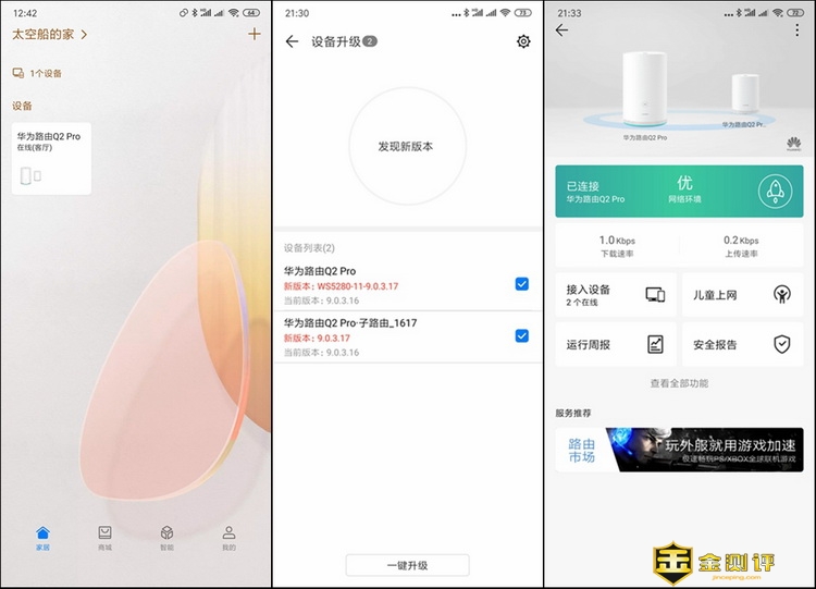 设置并绑定成功后的华为路由Q2 Pro会出现在设备界面里,点击对应图标就可以进入华为路由Q2 Pro主界面,当发现设备有新的固件时,智能家居APP也会及时的推送。