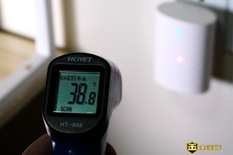我同样也使用了红外测温仪对子路由的发热情况进行测试,红外测温仪距离路由器约40cm的距离,其表面温度接近39度,比室内温度高了几度,令人可以接受。