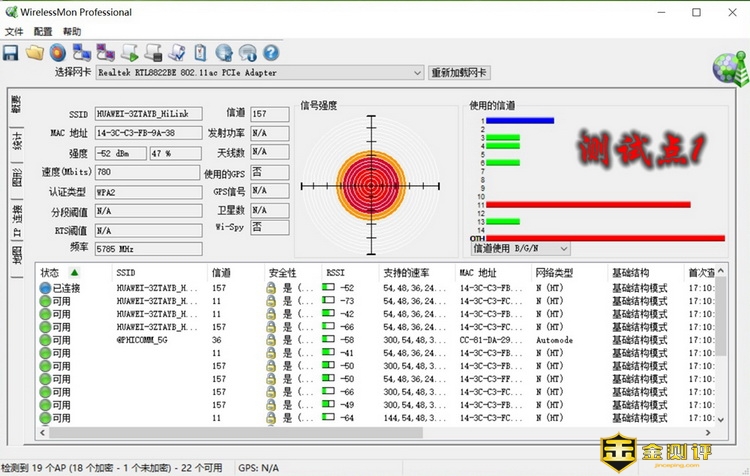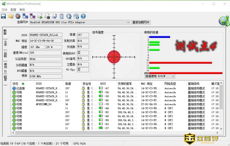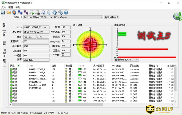从WirelessMon搜索到的周边所有的无线路由器、无线AP或无线基站发出的信号强度、信道等实时信息来看,华为路由Q2 Pro的信号最强、信道最多。从四个测试点的测试结果来看,信号最强的是测试点3,因为该测试点位于厨房,没有任何遮挡,而测试点1和测试点2的信号强度差不多。