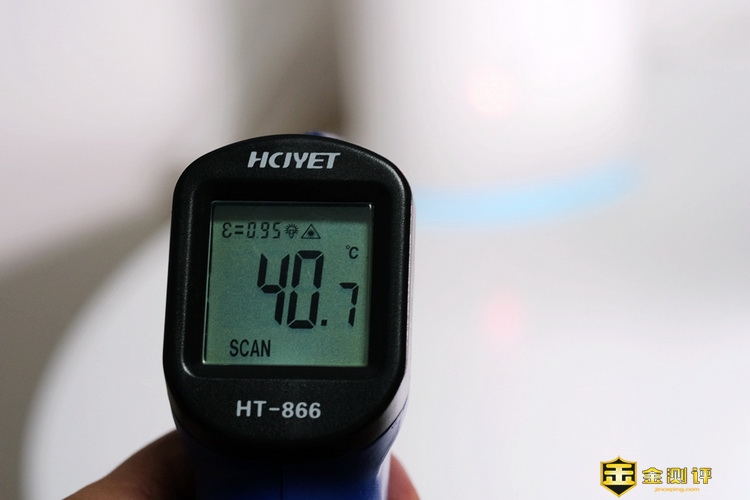 关于母路由的发热情况,我使用了红外测温仪进行测试,红外测温仪距离路由器约50cm的距离。在炎炎夏日里,母路由的表面温度大约在40度左右,我对这样的结果还算满意。