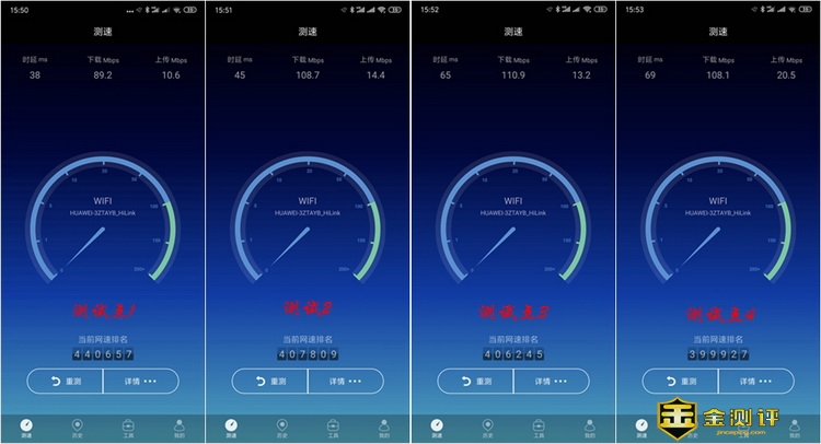 从测试的结果来看,华为路由Q2 Pro最高的下载速度为110.9Mbps,而最高的上传速度为20.5Mbps,四个测试点的下载与上传速度结果相差不大,但是在延迟表现上,测试点4会长一些,而一墙之隔的测试点1的延迟只有38ms,由此可见华为路由Q2 Pro下载、上传速度还是比较稳定的,而且WiFi的穿墙能力也比较强。
