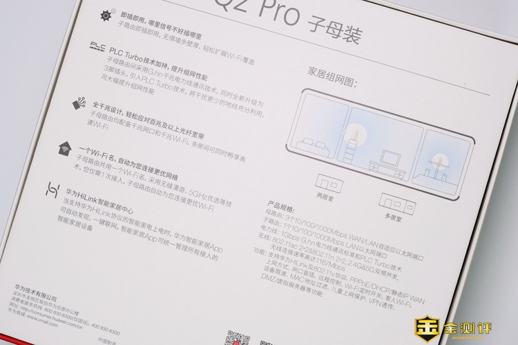 在包装盒的背面,印有华为路由器Q2 Pro工作原理的图文说明和产品规格。最初华为路由Q1支持1拖7,而华为路由器Q2 Pro则发展到1拖15,这显然对于居住在多层或者别墅的人来说是大大的方便,因为最简单有效的扩大Wi-Fi信号覆盖面积的解决方案,只需在单独购买子路由即可。