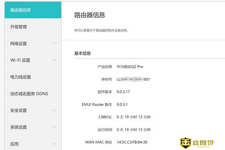 更多功能界面下有关于华为路由Q2 Pro的丰富的设置选项,包括了升级管理、网络设置、WiFi设置、电力猫设置、动态域名服务DDNS、安全设置、系统设置和应用共8个选项。