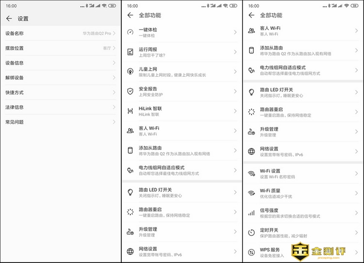 华为路由Q2 Pro的主界面比较简洁美观,置于主界面的接入设备、儿童上网、运行周报和安全报告四个选项,通过点击查看全部功能,可以进入更多的设置选项。其中一键体检对于普通用户来说还是非常实用的,让系统自动检测网络的安全与速度并进行优化。此外,常见的客人WiFi模式功能和WiFi穿墙模式的选择,华为路由Q2 Pro也具备了。