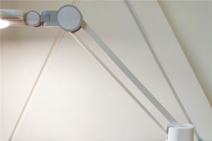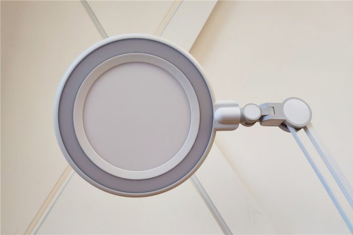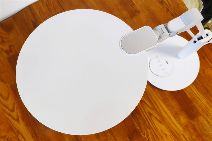 灯头反面就是台灯的灯罩,外表有一层光学过滤片,使发光更加柔和,灯罩采用“一面一环”的双光源设计,中间的面型光源能提升光源柔和度,而环型光源能提升光源均匀度,这种双光源搭配的设计,使光照度柔和均匀,从而避免用眼疲劳;另外,灯罩内还隐藏有216颗新型全光谱灯珠,也能保证照明亮度,后续再详细介绍。