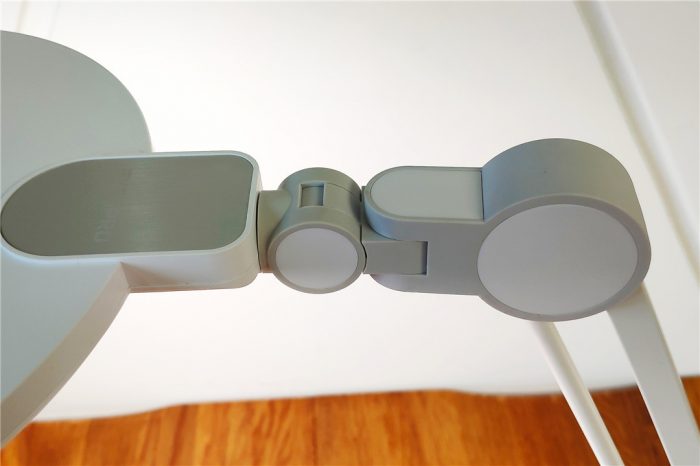 灯头顶面是一片ABS环保材质白板,后边与灯颈的衔接处设计了一块拉丝金属块,并印有孩视宝英文LOGO,这也是整个台灯唯一一处可见的产品标识,笔者非常喜欢这种淡化品牌的方式,如果是大大的LOGO反而显得更俗气。