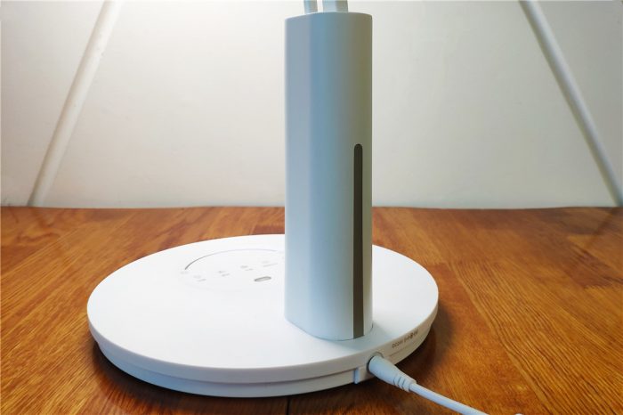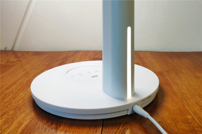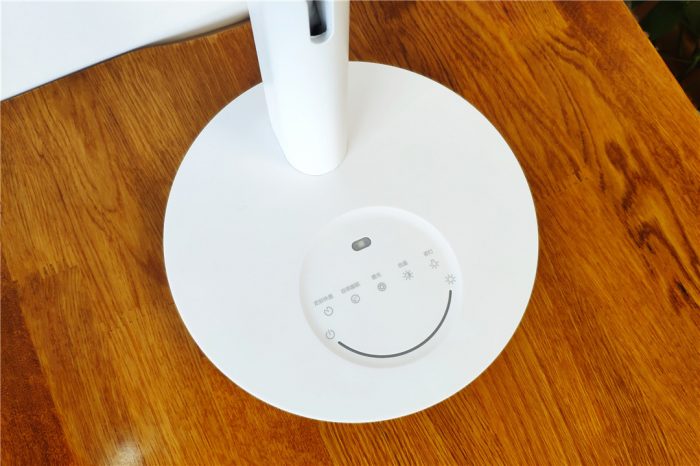 底座正面就是控制面板了,功能包括定时休息、自然睡眠、感光、色温、夜灯以及开关功能,此外还有笑脸形状的亮度触控条,所有功能均采用触控操作,操作十分灵敏,而且触控方式也能保证经久耐用;另外,在控制面板上,还有一个类似眼睛的感光芯片,能感知外界亮度,从而实现自动调光。