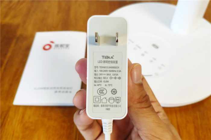 包装清单也比较简单,包括台灯主体、电源适配器和一份使用说明书,专用的电源适配器,采用了SELV输出电路,即安全特低压电路,如此能极大的提升用电安全,因为本款台灯多为儿童使用,选用这种特低压电路可见厂家对细节的掌控。