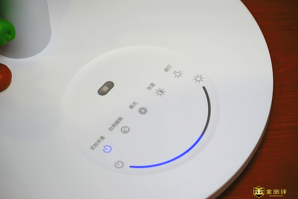 按钮方面,孩视宝台灯采用的是触控方面按钮,从左至右依次为定时休息(定时45分钟)、自然睡眠(15分钟)、感光(自动调光)、色温(色温切换)、夜灯(夜灯开关)。按钮上方为感光芯片,配合感光按钮自动调节亮度;按钮下方为台灯开关,蓝色弧线是亮度触控条,滑动调节台灯亮度。