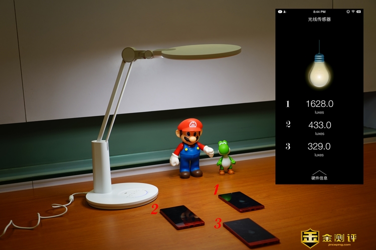 笔者根据日常使用习惯,将台灯调节至40厘米的高度,从1、2、3测量台灯最大亮度,读数见图。根据台灯使用标准,最大亮度1600流明有些刺眼,按说500流明就可以正常使用,下面测一下感光模式下亮度。