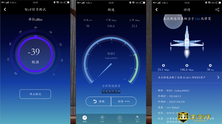 有了子机的助力,通过WIFI信号分析仪明显可以看到信号强度和网速又恢复活力了。