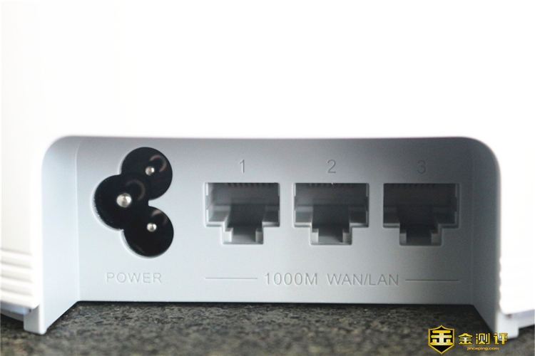 母路由的接口全部设计在背部底端,除了电源接口还有三个全千兆的网口,仔细观察三个网口并没有区别,而传统的路由器都会标明具体的接口使用,比如哪个是连接猫的,哪个是连接PC的。这是因为华为Q2 Pro路由器采用了智能化的设计,具有自动识别模式。三个网口不多不少刚刚好,因为现在现在需要连接网线的设备寥寥无几,而且也受空间的限制,大家宁愿选择wifi连接。
