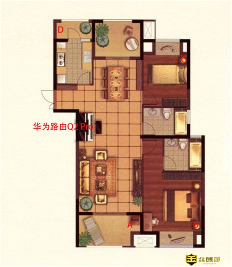 为了测试华为路由Q2 Pro子母路由器的信号强度以及穿墙能力,小编特意在户型图标识了华为路由Q2 Pro子母路由器的所在位置,以及四个测试点(A、B、C、D)位置,以家里在在用的移动光纤百兆宽带进行实测,下面就分别测试各个测试点的信号强度。