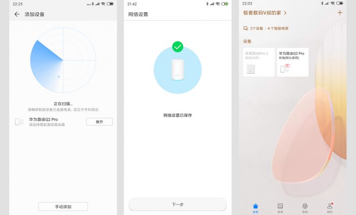 在接入网络后,需要安装智能家居APP来设置路由,可以通过应用市场或者扫码说明书上的二维码下载。添加华为路由Q2 Pro很简单,只需要简单几步就搞定了。当路由器状态灯为红色时表示未连接,显示蓝色时表示网络已连接!